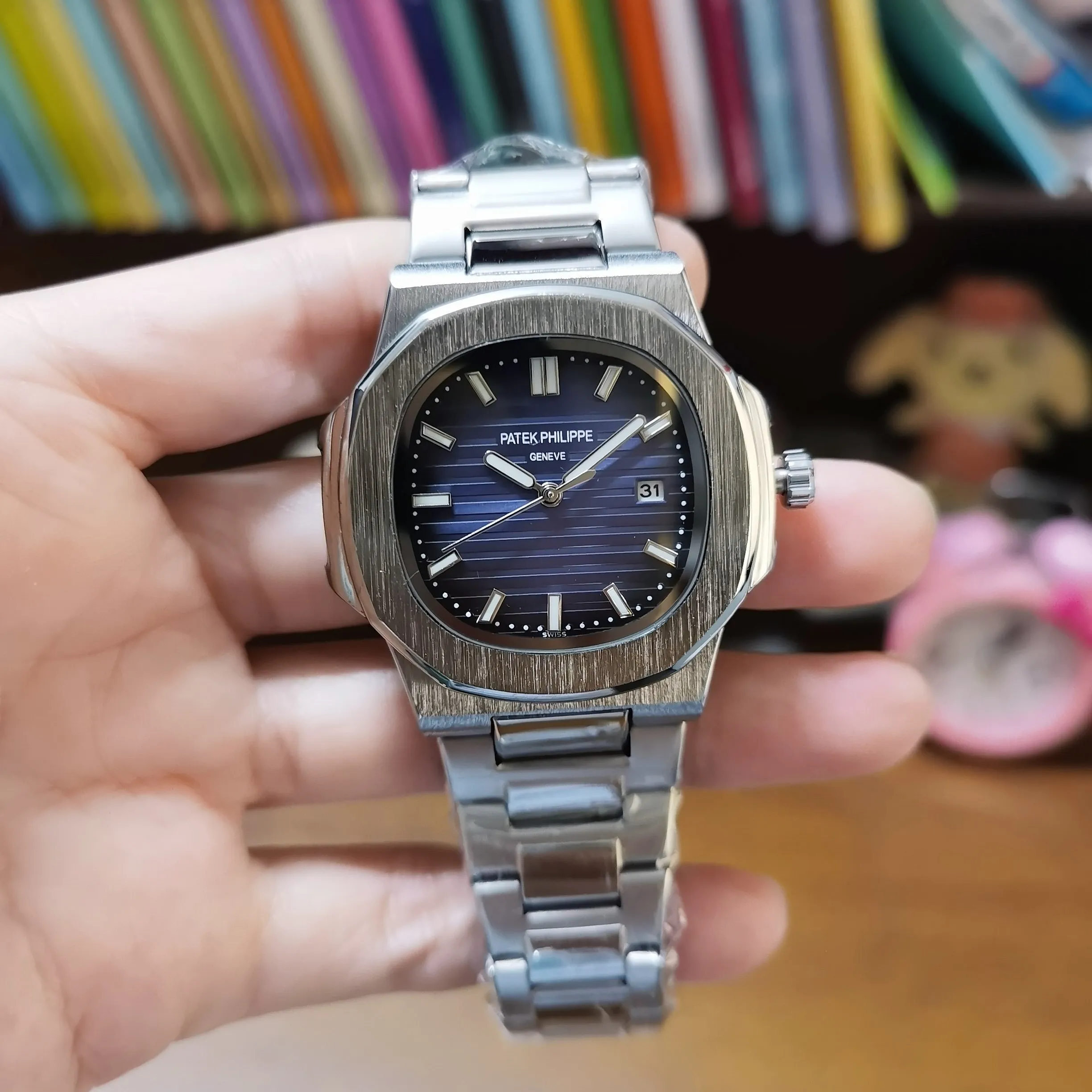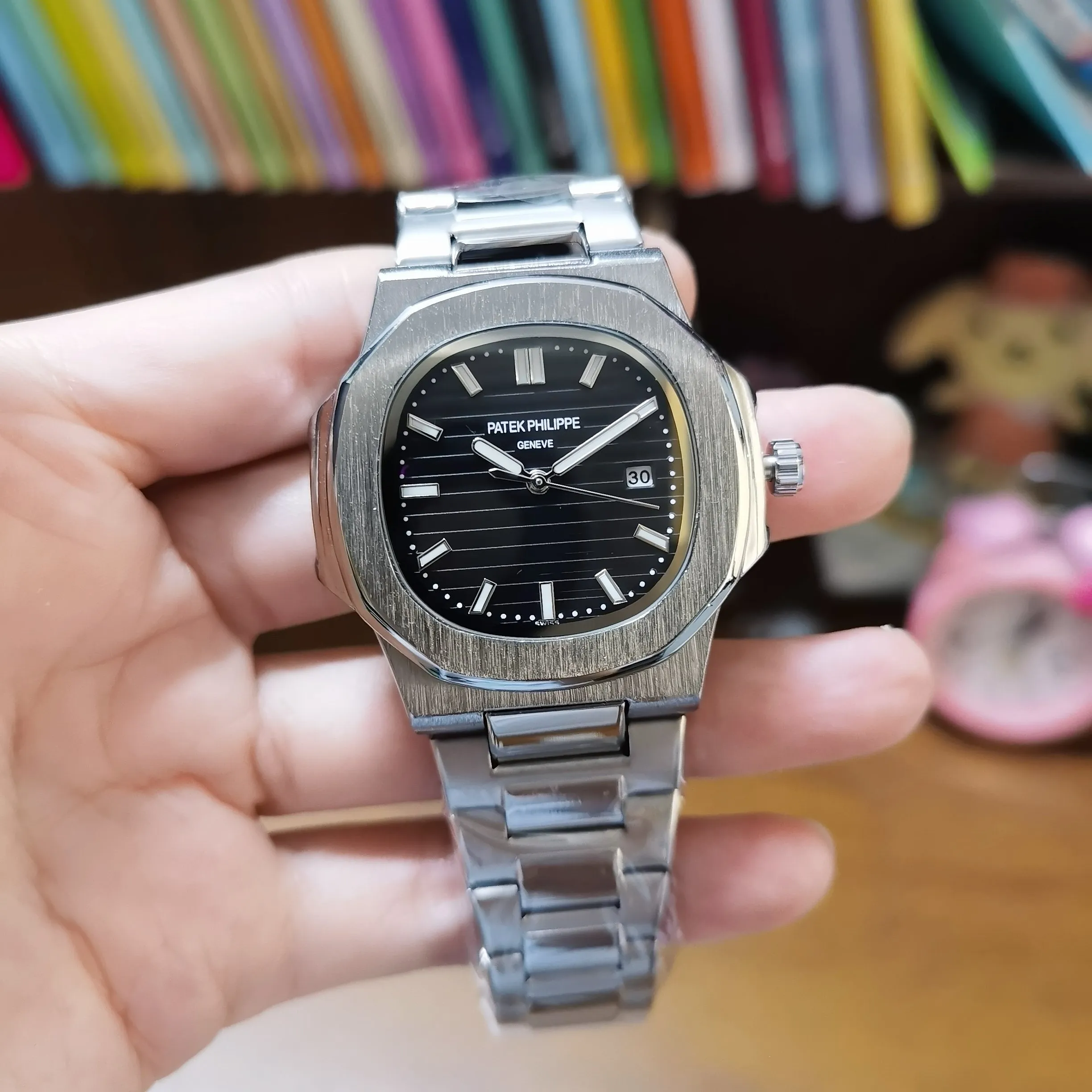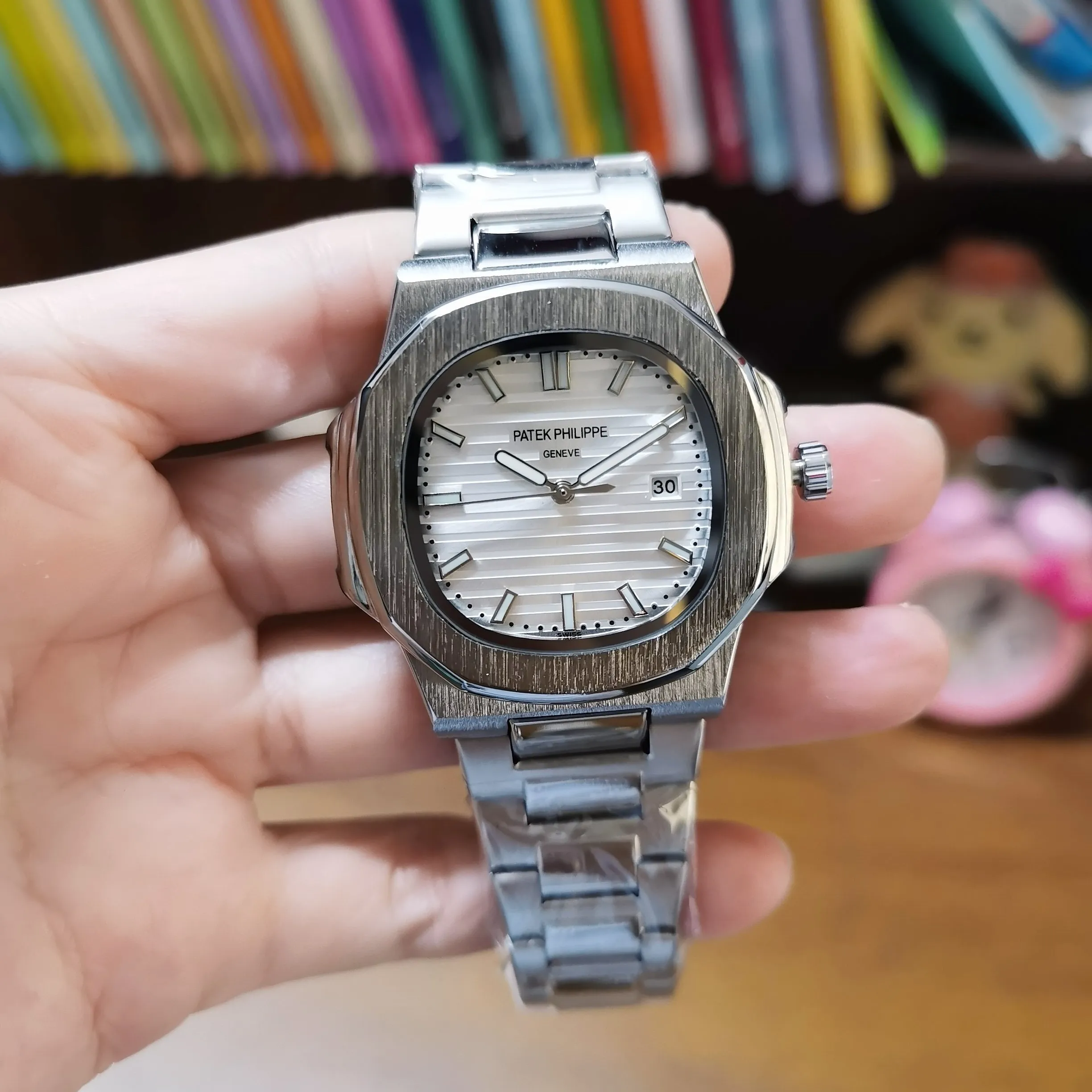 שעון: יוקרתי בעיצוב נאוטילוס קלאסי בגימור כסוף נקי ואלגנטי.