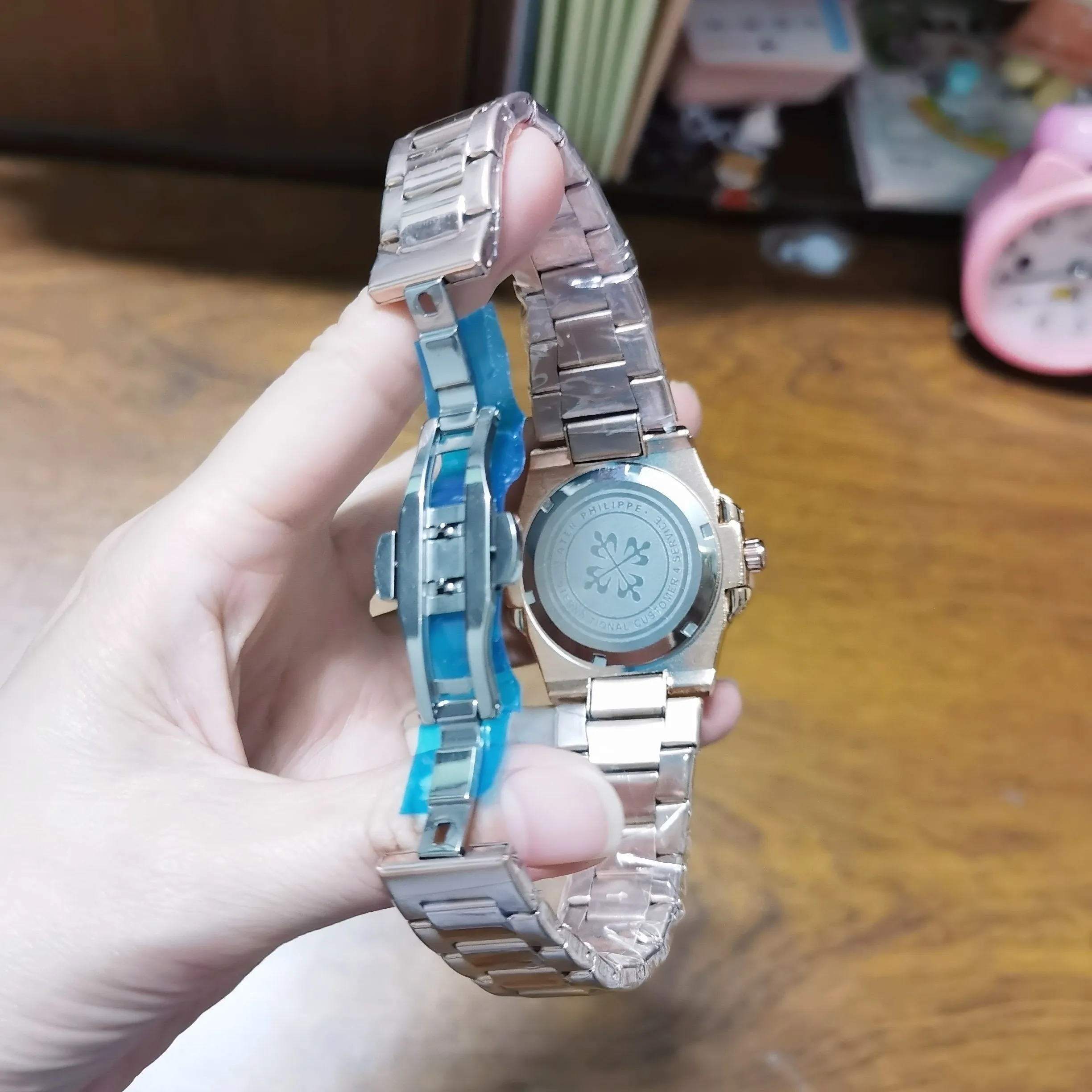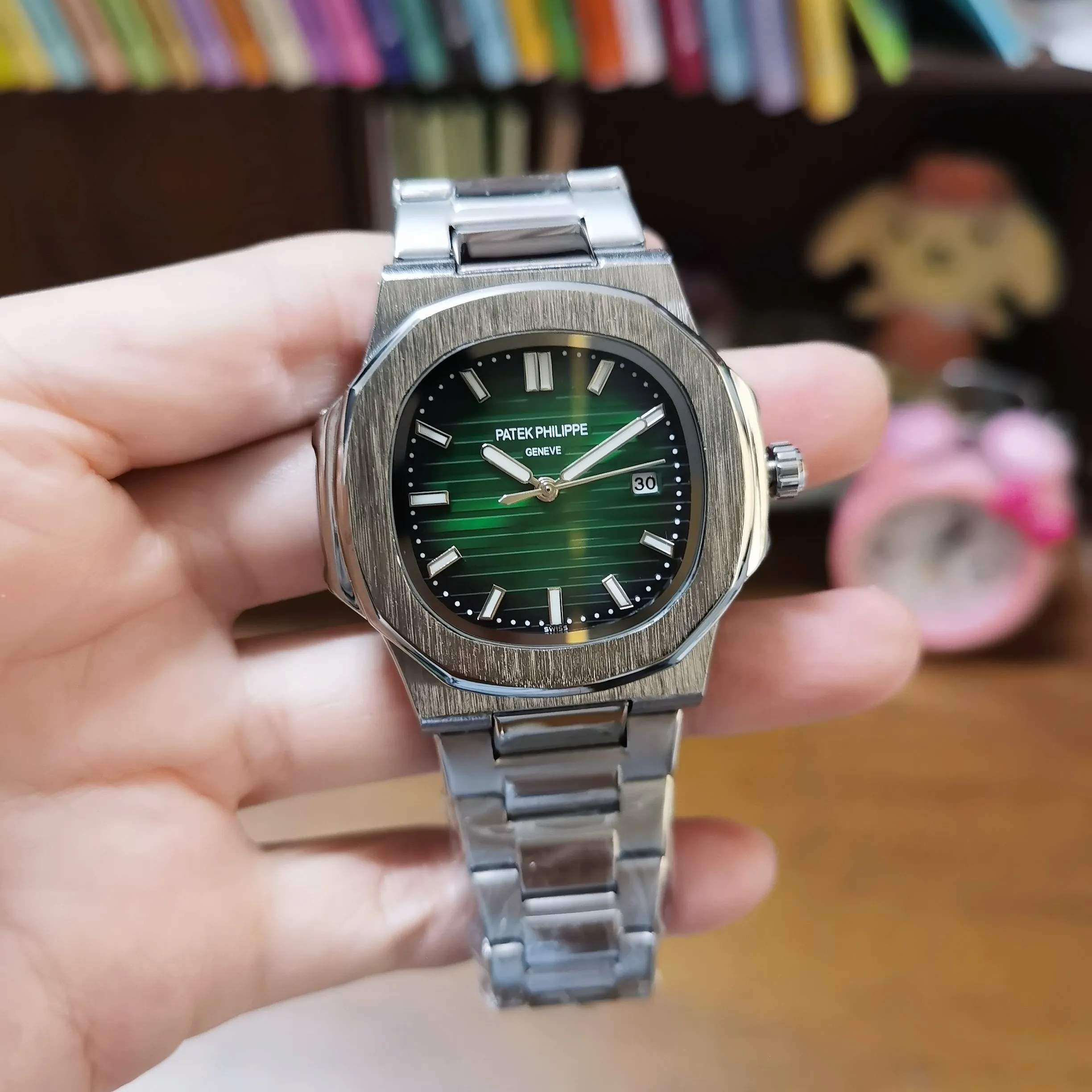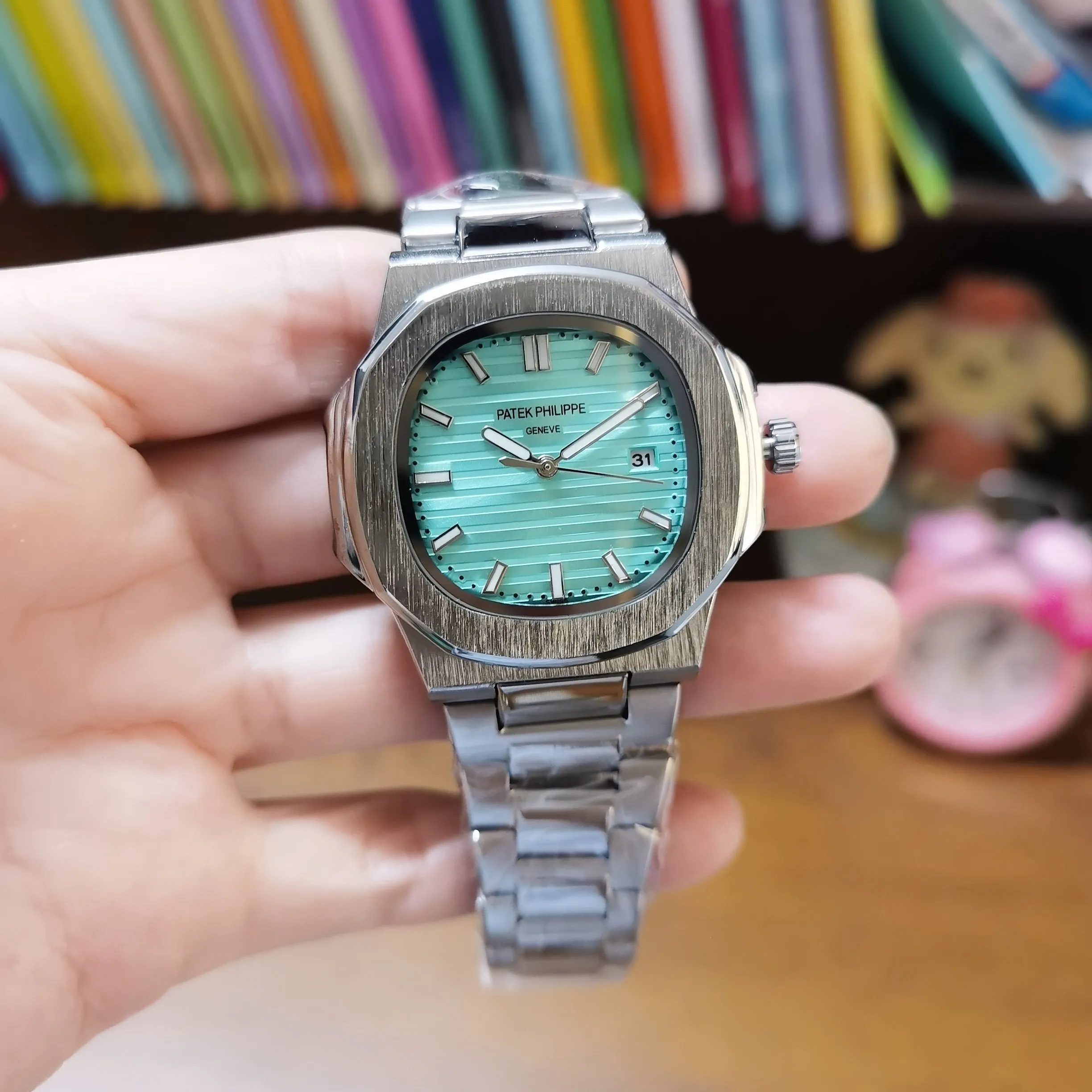 שעון: יוקרתי בעיצוב נאוטילוס קלאסי בגימור כסוף נקי ואלגנטי.