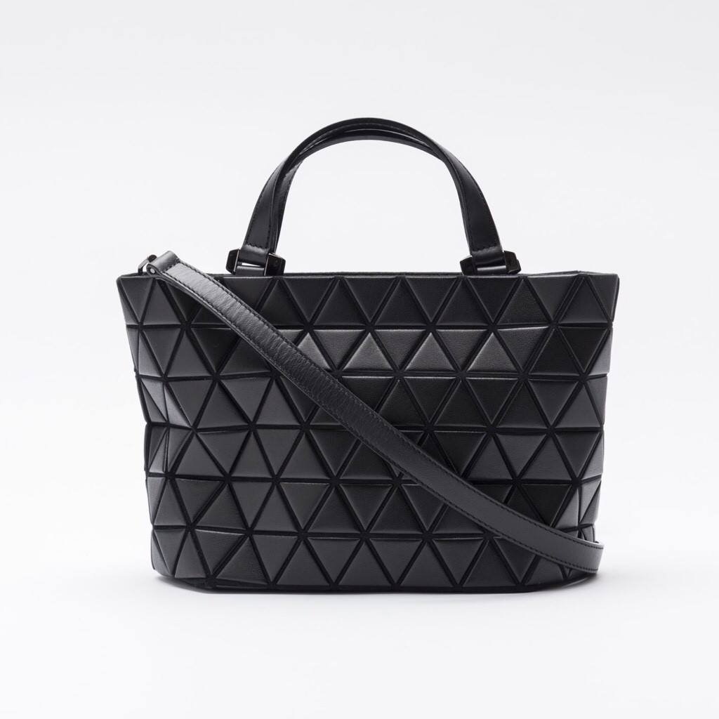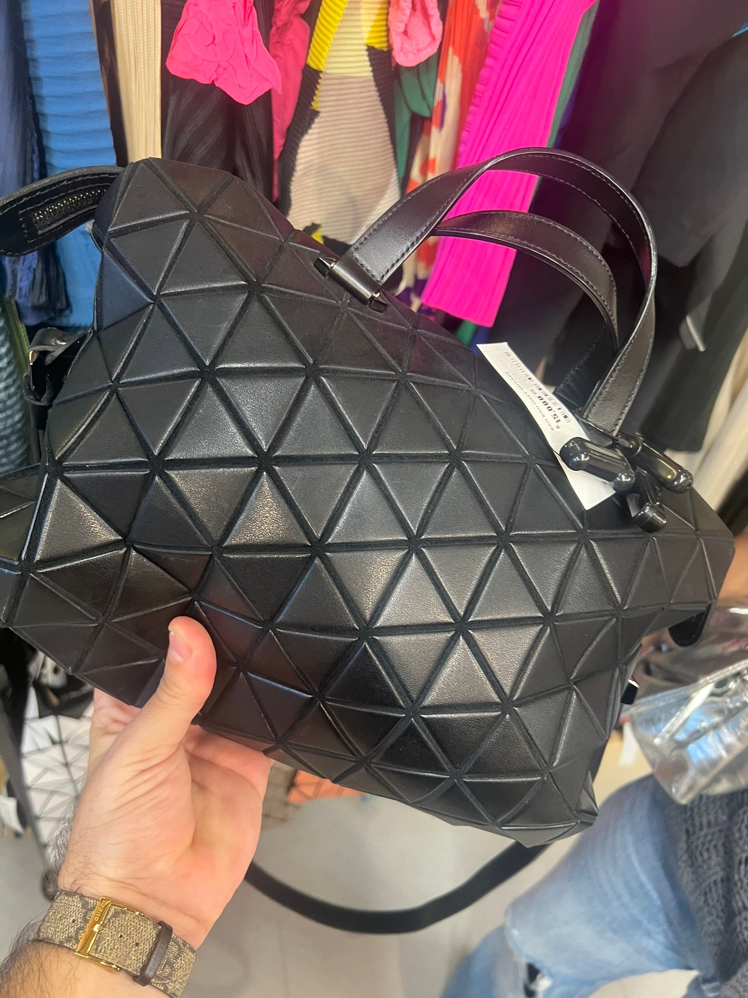 תיק יוקרתי מקולקציית Bao Bao של המעצב האגדי Issey Miyake, בעיצוב הגיאומטרי המפורסם. הדגם השחור הקלאסי עשוי מחומר גמיש ומבריק בגימור מאט, עם מבנה מודולרי שמשנה צורה בהתאם לתכולה.