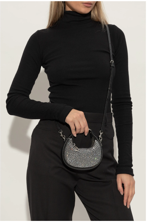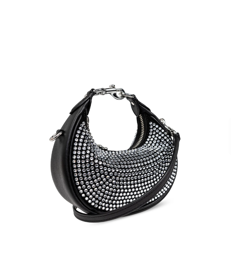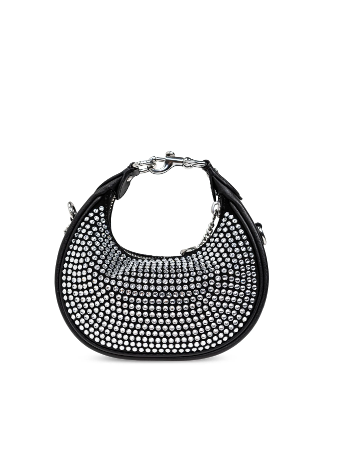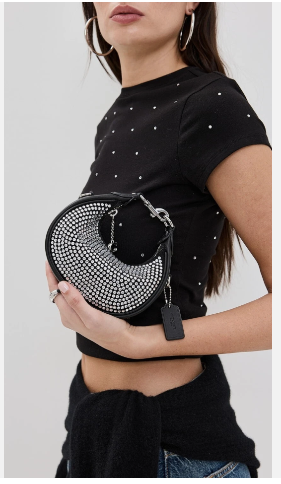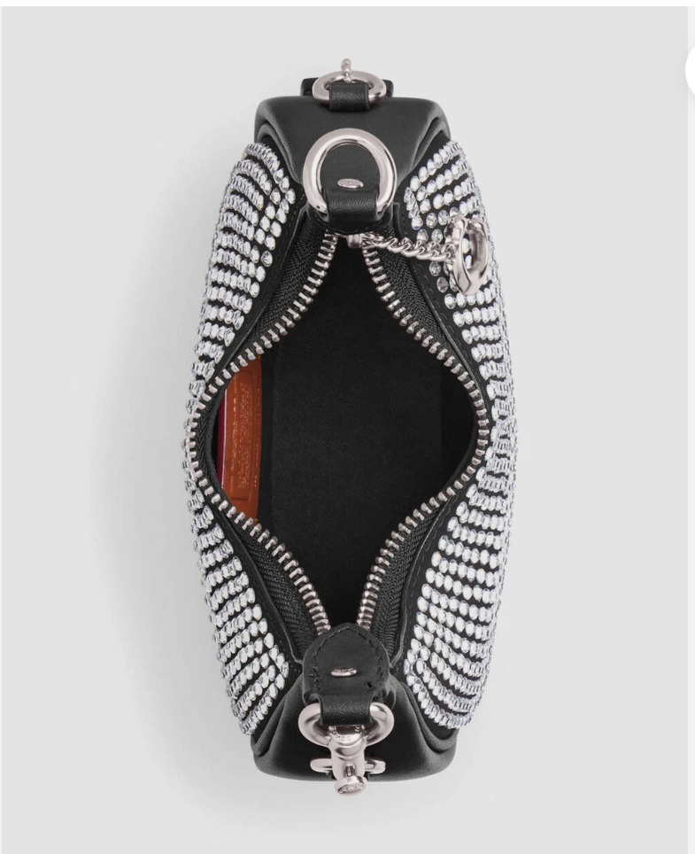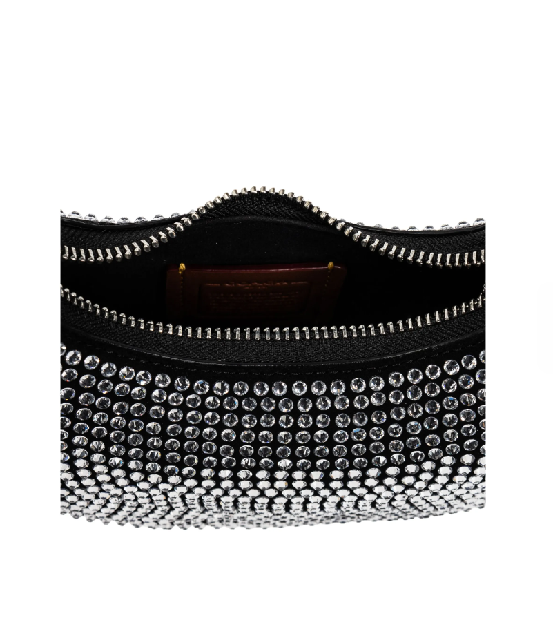 מקורי, יד שנייה במצב מעולה. תיק ערב קטן של Coach בעיצוב חצי ירח, עשוי עור שחור איכותי ומעוטר באבני קריסטל נוצצות לכל אורכו. כולל רוכסן עליון, בטנה פנימית, תווית עור מקורית של המותג ורצועת נשיאה קצרה. פריט אלגנטי ונוצץ, מושלם לערב, יציאה או מראה יומי יוקרתי.